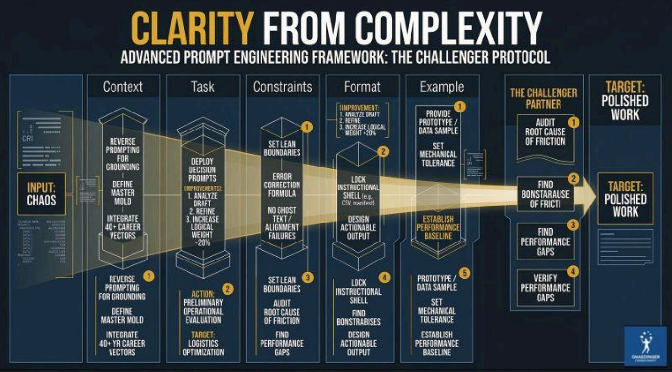 We have codified our approach to advanced prompt engineering into a rigorous framework designed to transform raw input (chaos) into polished, actionable work. We call it 'The Challenger Protocol'. This protocol is a five-stage tactical manifest built around mechanical tolerance and continuous logic improvement.
